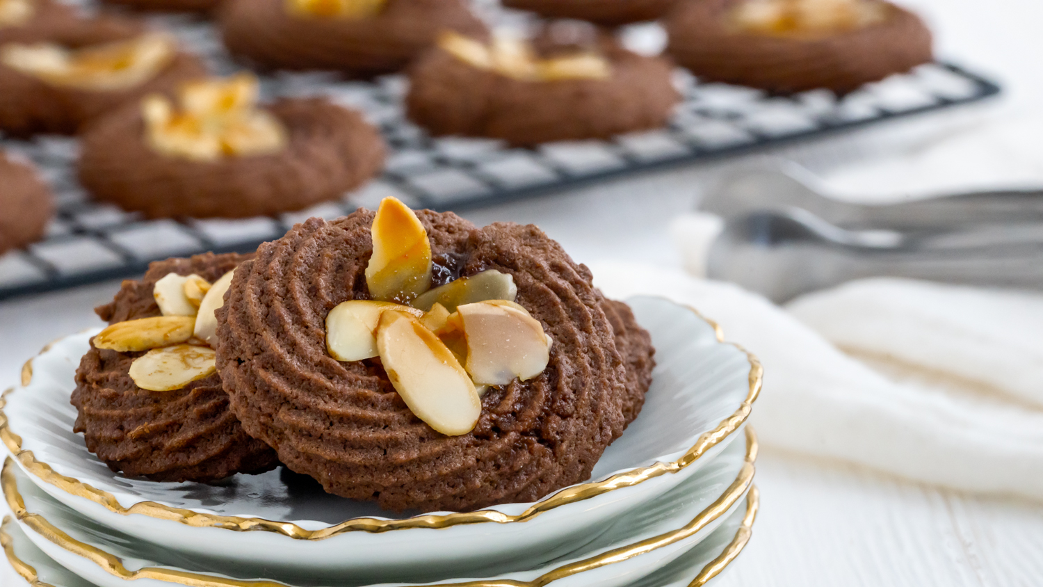 Dieses Schokoladen-Spritzgebäck lässt sich einfach auf das Backpapier spritzen und die Mandeln,