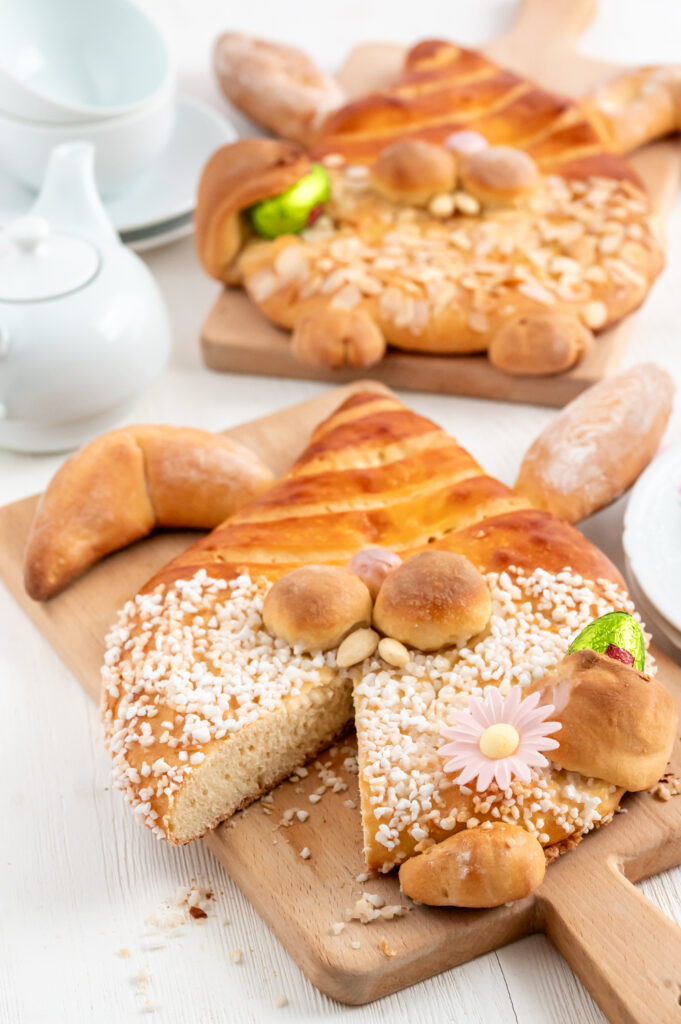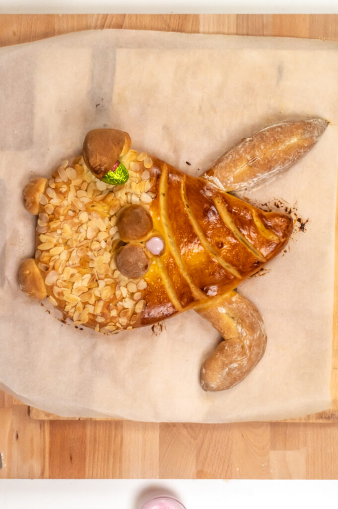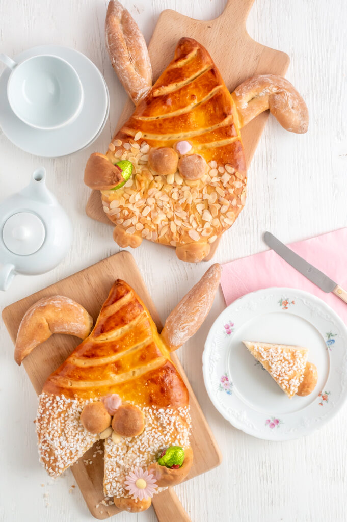 Der Brioche-Teig schmeckt gebacken wie ein weiches leicht süßes und reichhaltiges Brot mit einer feinen und elastischen Krume. Deswegen schmecken die Osterhasen aus Hefeteig bereits beim Frühstück als auch Nachmittags zum Kaffee. Ob man aus dem Rezept für die Osterhasen aus Hefeteig nur zwei große oder viele kleine Osterhasen macht, ist jedem selbst überlassen. Wir haben das so geregelt, dass jeder sich aus den zwei großen Hasen sein Lieblingsstück einfach selbst herausgeschnitten hat.