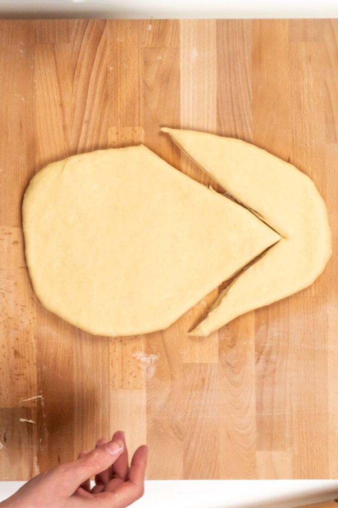 - Den Teig zu einer Kugel formen und diese auf eine Stärke von 1-2 cm ovak ausrollen. Mit einer Metall-Teigkarte ein Segment abstechen, dass ein Dreieck entsteht, das wird die Mütze des Osterhasen.