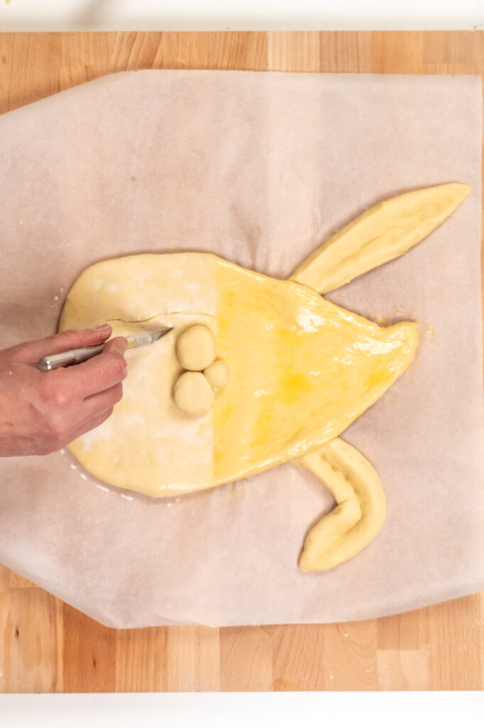 Damit die Ohren beim Osterhasenbacken die Einkerbung behalten, sollten dort in der ganzen Länge ein Schnitt gemacht werden, da sonst die Einkerbung beim Backen verschwindet.
