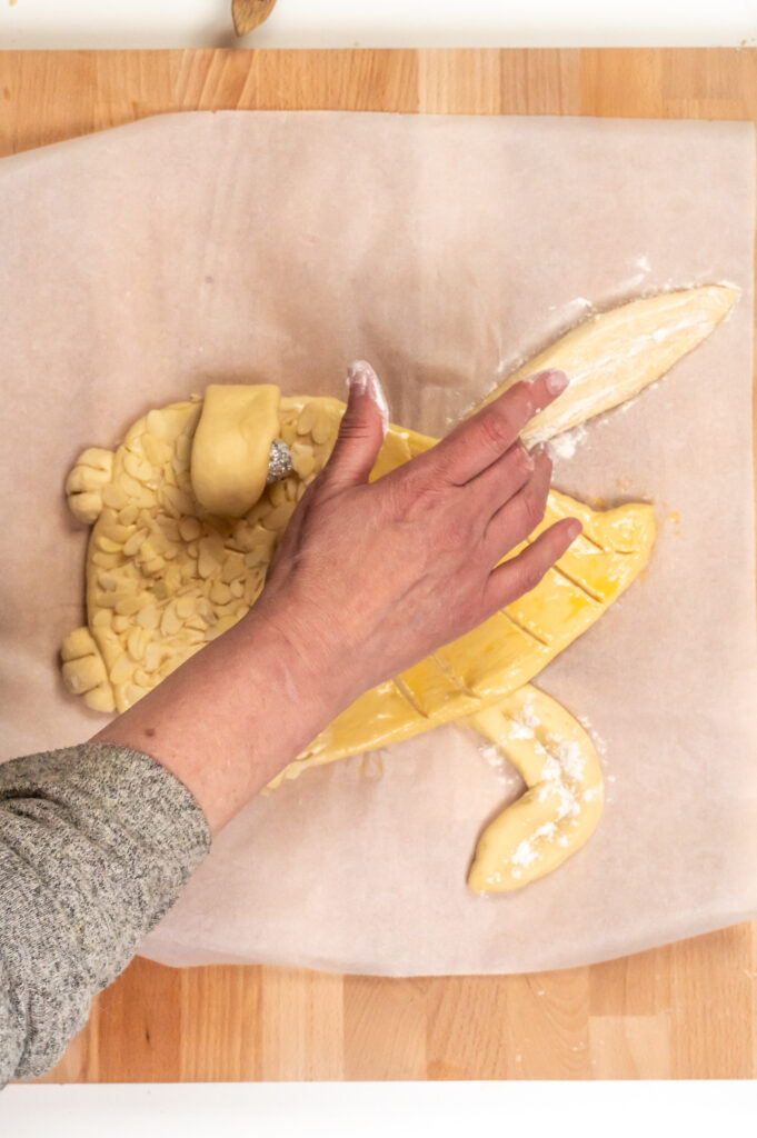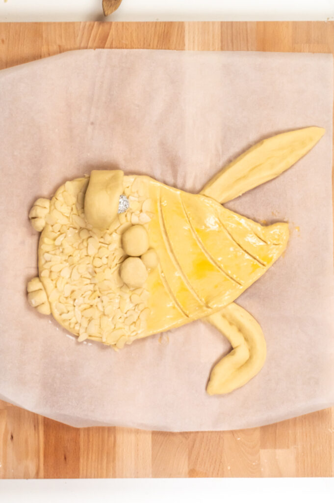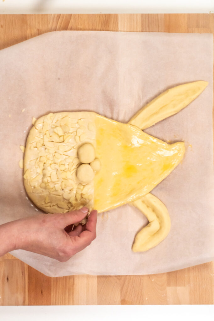 - Den Bauch mit Milch bestreichen und mit dem Hobby-Skalpell wild mit dünnen Strichen einschneiden. Dann mit Hagelzucker oder Mandelblättchen bestreuen.