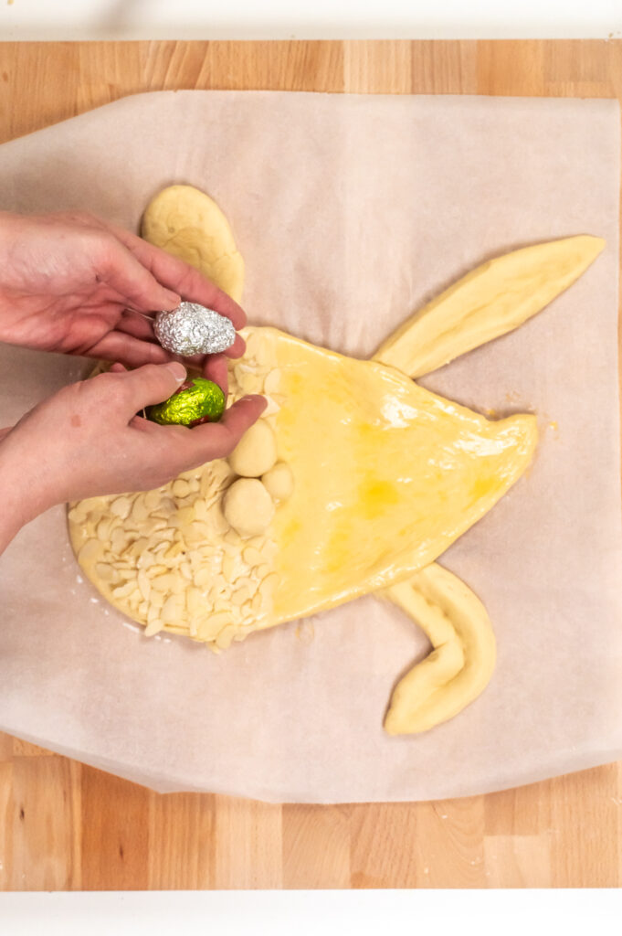 - Aus den Teigresten, eine kleine Kugel für die Nase und zwei größere Kugeln für das Schnäuzchen und Pfoten formen. Aus den restlichen Teigstücken eine Pfote und zwei Füße formen und unter der dem Hasenkörper befestigen. Evtl. mit Hilfe von etwas Ei-Milch Mischung. Das Osterei auf den Körper legen und die Pfote darüber. Wer sicher gehen möchte, das sich die Pfote beim Backen nicht öffnet, der Kann einen Zahnstocher durch die Pfote in das Ei stechen. Diese kann man nach dem Backen wieder vorsichtig entfernen.