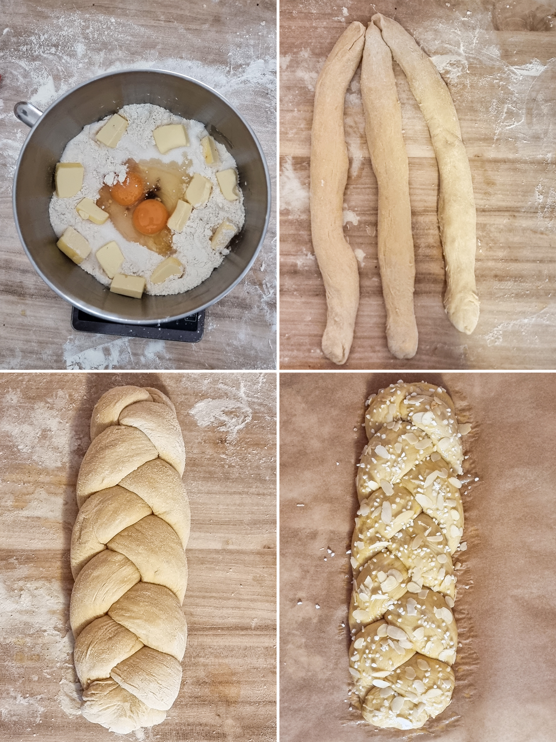 - Die Stränge an einem Ende zusammendrücken und von dort aus zu einem Zopf flechten. Den fertigen Zopf auf ein Backpapier setzen und die Enden unter dem Zopf legen.Das Ei verkleppern und den Zopf damit einstreichen